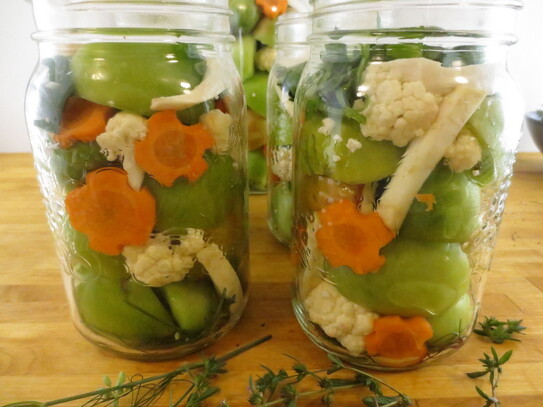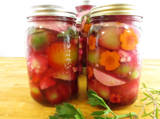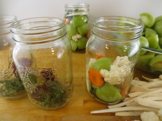 Pe fundul borcanelor, care au fost spălate şi pregătite din timp, se aşează mărarul,cimbru şi câteva frunze de vişin, apoi 1-2 felii de sfeclă roşie, morcovi tăiaţi rondele, câteva felii de mere , apoi gogonele, conopidă, morcovi, ţelina tăiată în felii şi ardei iuţi (opţional).