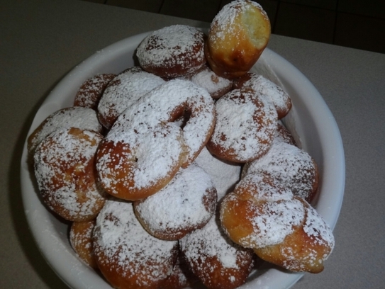 Masa se presară cu făină pentru a nu se lipi aluatul. Se întinde o foaie cam de 1,5 cm grosime şi se taie cu un pahar formele dorite. Se mai lasă la crescut 10-15 minute şi apoi se coc în uleiul bine încins.