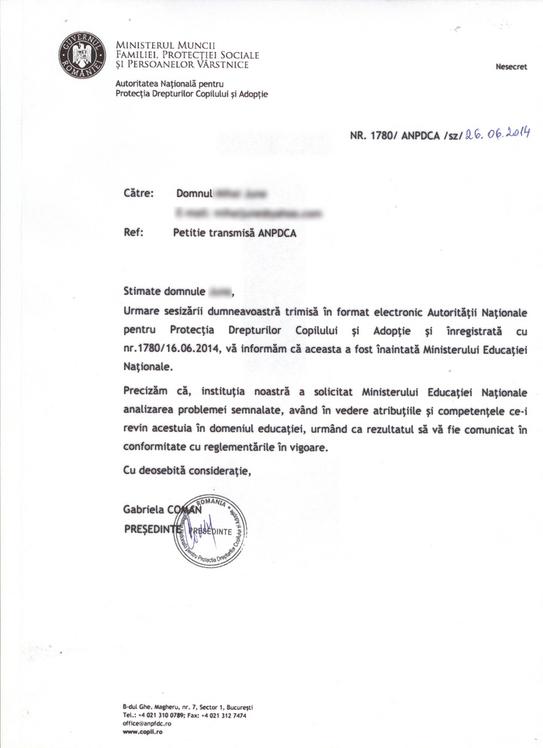 Din partea ANPDCA i-a răspuns, în data de 26. 06 a.c., cu deosebită consideraţie, preşedintele instituţiei, Gabriela Coman, care i-a comunicat dlui M.J. că memoriul său a fost direcţionat către Ministerului Educaţiei şi că rezultatul îi va fi comunicat "în conformitate cu reglementările în vigoare" (vezi răspunsul în slide-ul anexat articolului, pe pagina originală Epoch Times).
