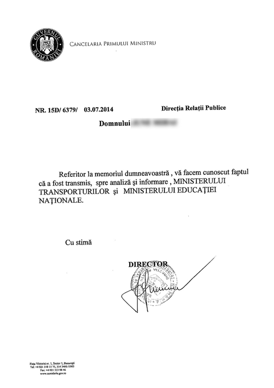 O săptămână mai târziu, dl M.J. a găsit în inbox şi răspunsul de la Cancelaria Primului Ministru. Echipa premierului Victor Ponta îl informa că, cităm, memoriul său a fost transmis "spre analiză şi informare" Ministerului Transporturilor şi Ministerului Educaţiei Naţionale. Spre deosebire de ANPDC, Cancelaria Primului Ministru nu i-a promis că îi va comunica rezultatul deliberărilor celor două ministere.
