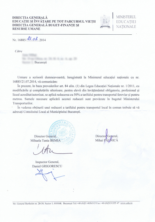 Ministerul Educaţiei i-a trimis dlui M.J. un răspuns halucinant (vezi anexa în slide) şi anume că, în conformitate cu art. 84 aliniatul 1 din Legea Educaţiei Naţionale nr. 1/2011, elevii beneficiază de 50% reducere la transport. Cât despre întrebarea concretă a dlui M.J., care se referea la art 84(2) din legea educaţiei, modificat de OUG 117/2003, răspunsul MEN nu conţinea absolut nicio referire la ea, de parcă nu ar fi fost niciodată întrebat.