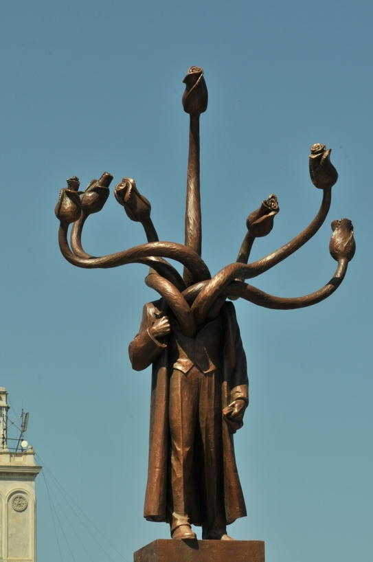 La o sumară observaţie sculptura înfăţişează un corp – aparent al fostei statui a lui Lenin, aşezată de comunişti cam în acelaşi loc, după cum au scris şi colegii mei de la metropotam.ro - căruia i-au crescut mai multe capete, vreo şapte la număr, care se termină printr-un boboc de trandafir?!
