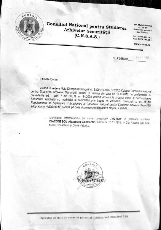 Profesorul universitar Alexandru Diaconescu de la Universitatea Babeş-Bolyai din Cluj a fost informator al Securităţii comuniste, sub numele conspirativ ”Victor”, dezvăluie gazetadecluj.ro, care prezintă, în exclusivitate, un act de la Consiliul Naţional pentru Studierea Arhivelor Securităţii (CNSAS) care atestă această "calitate" a profesorului clujean.