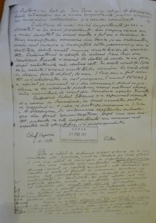 Ofiţerul care l-a racolat pe Alexandru Diaconescu, Ioan Brad, a scris următoarele pe nota semnată Victor, mai arată sursa citată: “nota se referă la profesorul Robert Etiene de la Universitatea din Bordeaux, venit în România pe filieră oficială şi care s-a aflat la Cluj-Napoca în intervalul 26.10-02.11 ac (n.r. 1989). Sursa a primit sarcina să ne informeze sistematic în legătură cu participarea istoricilor clujeni la această manifestare, pregătirile ce se fac în acest scop şi eventualele probleme care se ridică”.