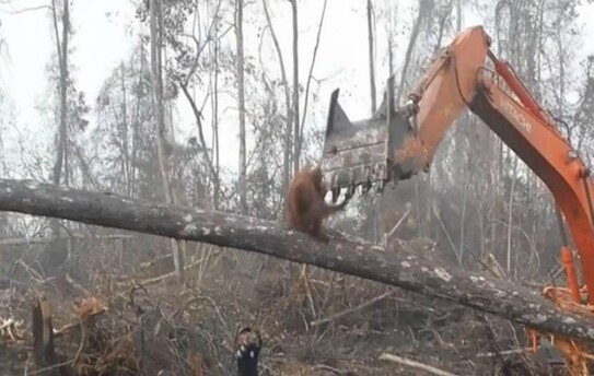 Imagini dureroase în Indonezia: un urangutan se confruntă cu un excavator care-i distruge habitatul (video)