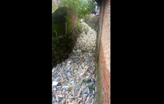 Clipul video filmat în Manado City, Indonezia, arată un canal complet plin de deşeuri - în special sticle de plastic - iar apa este practic invizibilă. Este o imagine simbolică a poluării devastatoare care ajunge în oceane.