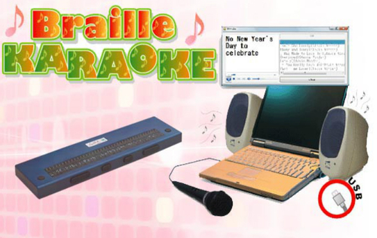 Sistemul, explicat într-un mod foarte simplu, constând într-un PC conectat la dispozitivul karaoke şi la reţeaua de joysound, traduce textele în Braille şi re-trimite datele către karaoke ce le vizualizează sub formă de puncte care apar, la rândul lor, afişate pe un display pin. Dispozitivul karaoke de tip Braille este capabil să proceseze texte în japoneză, engleză, italiană şi chineză.