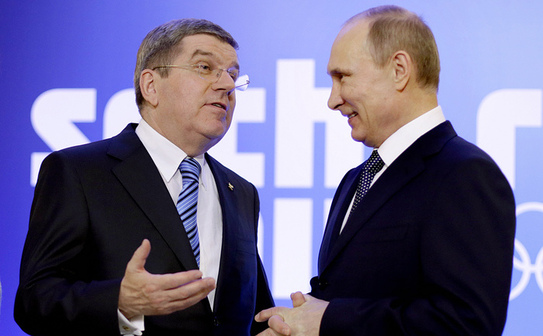 În cursul ceremoniei oficiale de prezentare a membrilor CIO preşedintelui Rusiei, care a făcut din aceste Jocuri un simbol major de revenire a Rusiei pe scena internaţională, preşedintele forului olimpic, Thomas Bach, a avut numai cuvinte de laudă la adresa lui Putin.