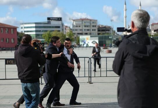 Anterior în aceeaşi zi, în timp ce Dündar ţinea o scurtă conferinţă de presă în faţa tribunalului pe durata pauzei procedurilor, un bărbat înarmat a tras înspre el. Dündar nu a fost rănit, dar un reporter de televiziune ce acoperea procesul a fost rănit uşor.