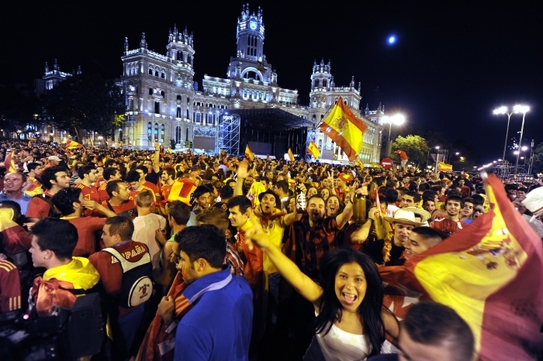 Spania, Spania, Spania - este titlul mare al cotidianului La Razon, tot pe prima pagină, în ritmul scandărilor fanilor care au îmbrăţişat această nouă victorie. Cotidianul menţionat scrie că selecţionata de fotbal face istorie după ce câştigă a treia coroană, învingând Italia şi câştigând din nou Cupa Euro.