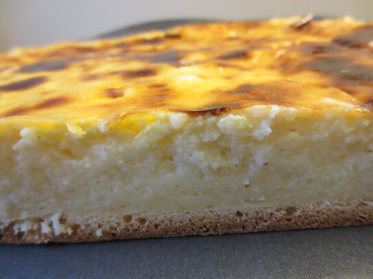 După ce aluatul este dospit, se întinde o foaie groasă de un deget ( cca 3 mm). Foaia se aşează într-o tavă tapetată hârtie de copt sau cu făină. Se pune pasta de gris pe deasupra, apoi se toarnă uniform amestecul de gălbenuşuri cu smântână. Se coace la cuptor la foc potrivit (180 C) circa 30-40 de minute.