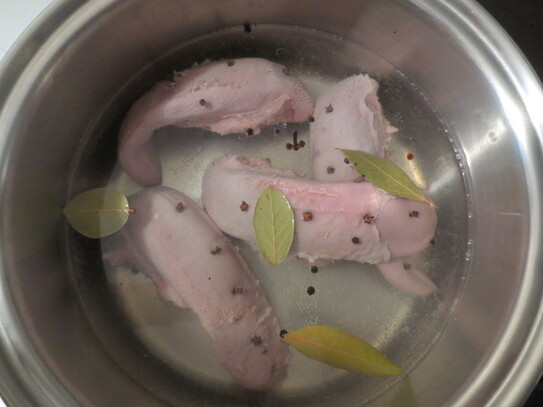 După ce limba e fiartă, se curăţă de piele cât este încă fierbinte, cu ajutorul unui cuţit mic, începând de la vârf şi trăgând uşor spre baza limbii. Se scot şi cuişoarele, apoi se taie apoi în felii groase de aproximativ 2 cm.