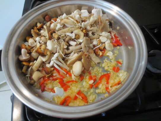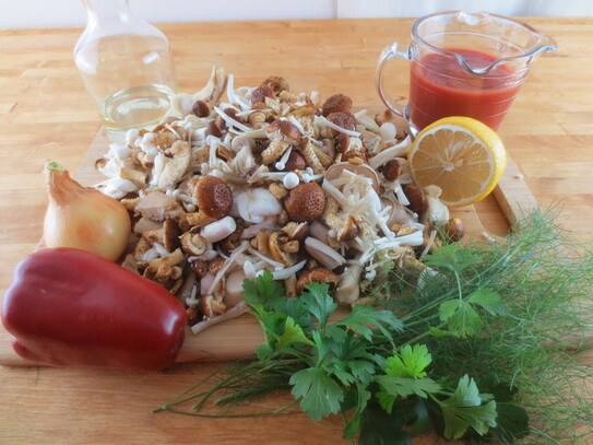 Ciupercile se spală bine în mai multe ape, apoi se taie în felii mai mari. Ceapa se toacă mărunt iar ardeiul se taie în cubuleţe.