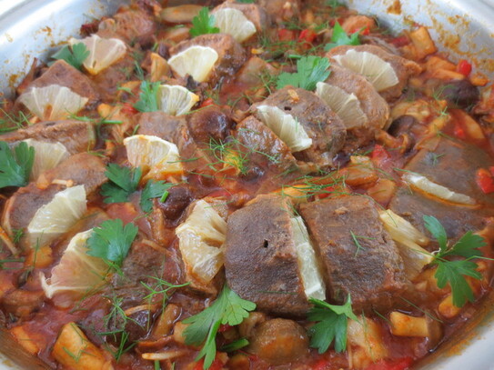 Ciupercile se pun într-o cratiţă care se poate pune la cuptor, apoi se aşează bucăţile de limbă, alternând cu câte un sfert de felie de lămâie curăţată de coajă.