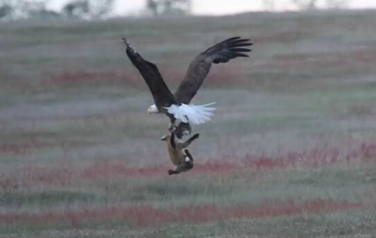 Vulpea tocmai prinsese un iepure atunci când marea pasăre de pradă din America de Nord s-a repezit spre ea: dar, cum vulpea nu a renunţat la pradă a fost târâtă în aer timp de câteva secunde. În cele din urmă a trebuit să se desprindă de iepure şi a căzut la pământ, lăsând pajura să-i fure cina.