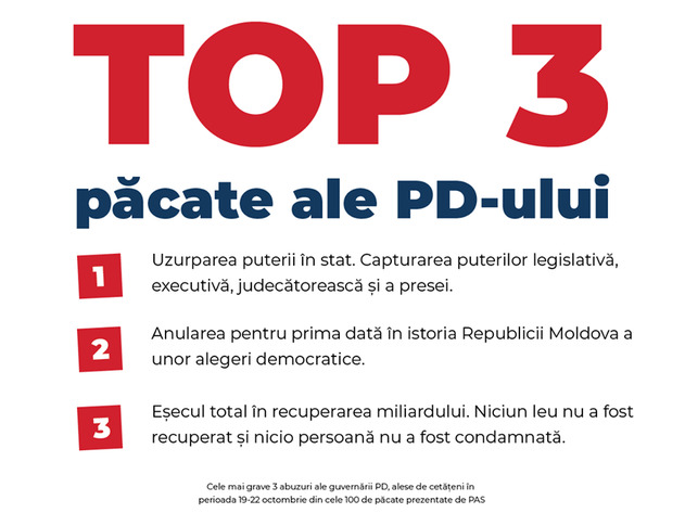 „Am rugat cetăţenii să ne spună care dintre acestea sunt cele mai grave, în primele 5 clasându-se uzurparea puterii, anularea alegerilor, eşecul în recuperarea miliardului, adoptarea sistemului mixt şi răpirea cetăţenilor turci. Oamenii sunt foarte conştienţi cu privire la pericolul menţinerii la putere a PD-ului şi necesitatea de a elibera ţara ACUM!”, a conchis Maia Sandu.