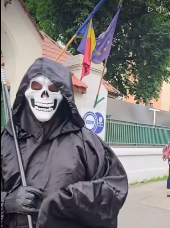 Marian Ceauşescu, îmbrăcat în Moartea cu Coasa, în faţa spitalului unde e internat Ion Iliescu