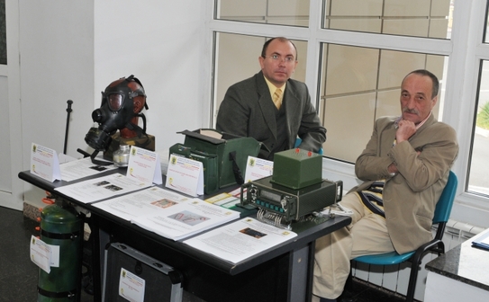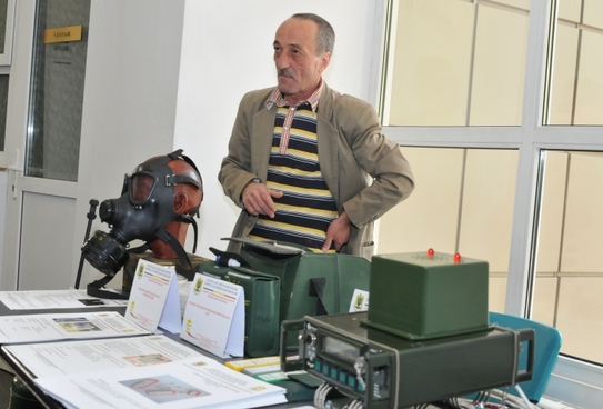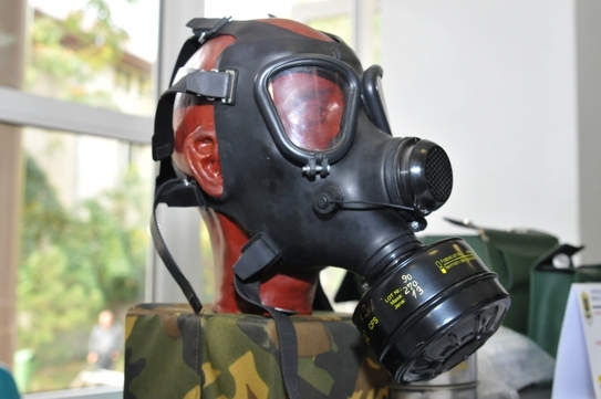 Expoziţie cu dozimetre, măşti de gaze şi dispozitive de decontaminare cu ceaţă activă