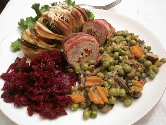 - Rulou din cotlet de porc, cartofi cu brânză la cuptor, garnitură de mazăre cu ciuperci şi salată de sfeclă