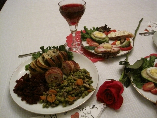 Reteta de rulou din cotlet de porc, cartofi cu brânză la cuptor, garnitură de mazăre cu ciuperci şi salată de sfeclă este publicata separat. Pentru detalii regate de reteta, faceti o cautare dupa rulou de porc.