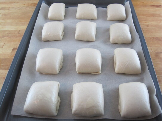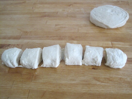 Pe rând, din fiecare parte se face un rulou de aluat care apoi se împarte din nou în şase părţi egale. Bucăţile finale vor cântări între 65-70 g fiecare.