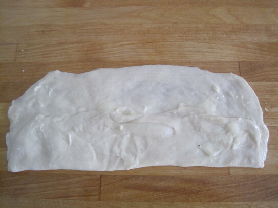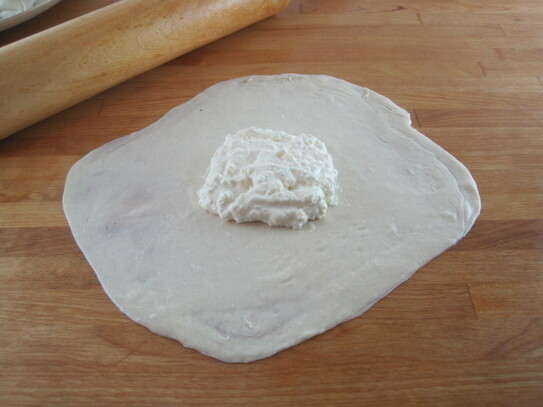 După ce au trecut cele două ore, aluatul se scoate de la rece şi se întinde din nou în pătrate. Puneţi în mijloc umplutura de brânză tot în formă de pătrat, apoi împăturiţi aluatul în formă de plic, aducând colţurile pătratului de aluat spre centru, suprapunându-le.