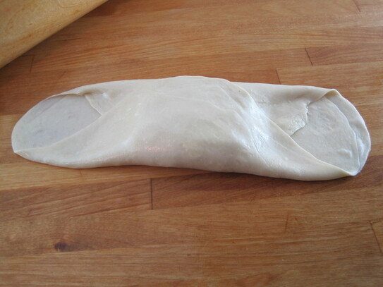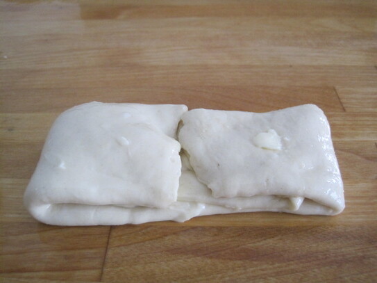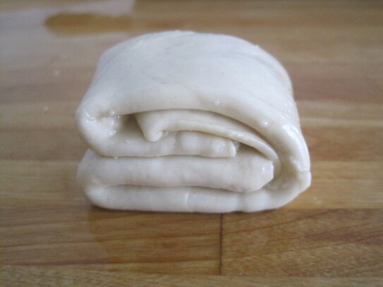 Mai întâi, se unge masa de lucru cu ulei, după care se ia câte o bucată de cocă şi se întinde în formă de pătrat de 15 cm. Se unge cu un strat subţire de unt moale, apoi se împătureşte în trei pe verticală, formându-se un dreptunghi care se unge din nou cu unt pe deasupra, după care se împătureşte în două pornind de la margine spre jumătatea dreptunghiului. Ungeţi din nou cu unt, apoi împăturiţi părţile una peste cealaltă, rezultând un pătrat cu latura de 4 cm. Ungeţi pătratul obţinut cu ulei, după care îl aşezaţi pe o farfurie şi-l acoperiţi cu o folie de plastic.