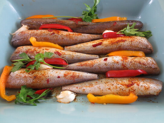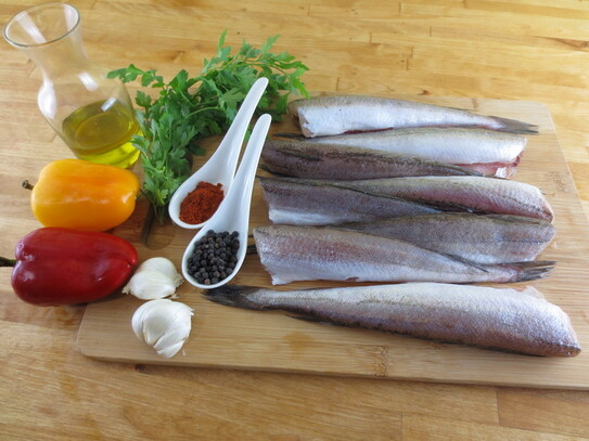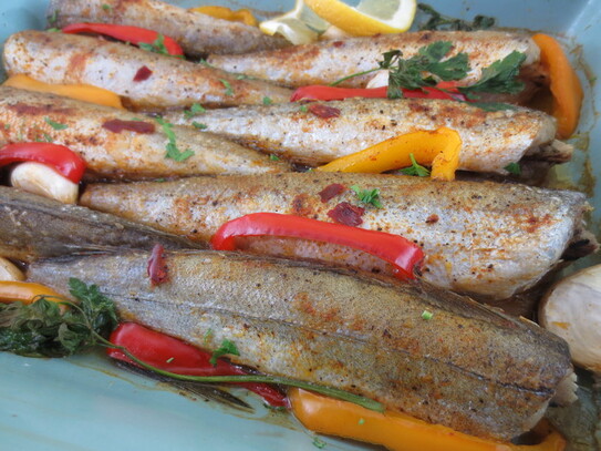 Peştele se curăţă de intestine şi solzi, se spală bine cu apă rece, apoi se şterge cu un şerveţel de hârtie, pentru a absorbi apa. Puneţi peştele apoi într- o tavă de copt, după care presăraţi sare , piper, paprică şi ulei pe ambele părţi. Dacă doriţi un peşte picant, se pot adăuga şi câteva rondele de ardei iute.