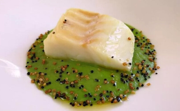 Merlucius pe cremă de mazăre şi quinoa crocantă