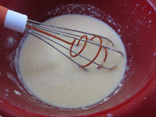 Separat se amestecă untul topit cu ouăle, după care se adaugă treptat laptele călduţ şi vanilia.
