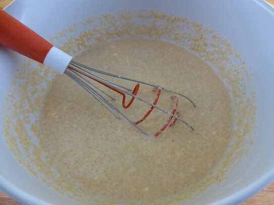 Într-un castron mare, se combină făina de porumb, migdalele măcinate, făina de orz, zahărul, sarea şi praful de copt şi se amestecă bine.