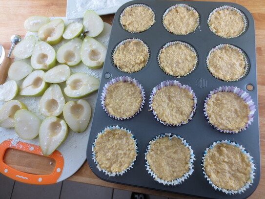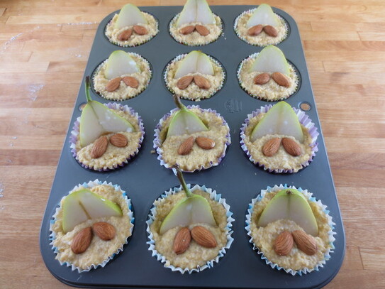 Aluatul se toarnă în părţi egale în formele de brioşe, se nivelează, apoi se adaugă in mijlocul fiecărei brioşe câte o felie de pară şi două migdale.