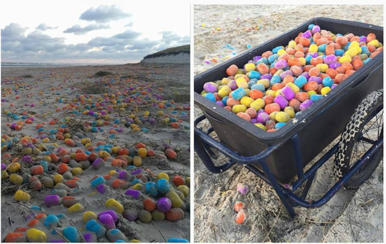 Conform ziarului Der Spiegel, aceste capsule din plastic conţineau jucării în interior şi au "presărat" câţiva kilometri de plajă. Singurul lucru care lipsea era ciocolata.