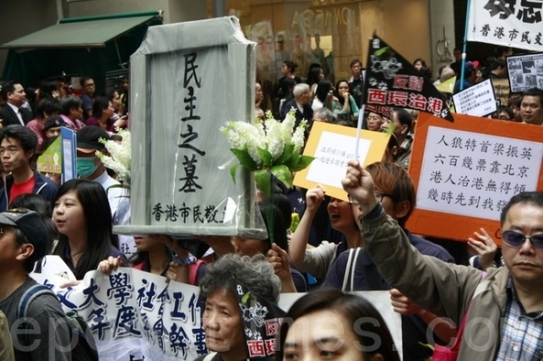 HONG KONG - Pe 25 martie, un număr mic de alegători desemnaţi au ales un nou director executiv pentru regiunea administrativă specială Hong Kong, iar pe 1 aprilie, un protest în masă a avut loc, cerând demisia lui. Protestatarii susţin că nu doresc să fie conduşi de un membru al Partidului Comunist Chinez şi că vor ca PCC să nu mai intervină în alegerile din Hong Kong şi să înceteze să corupă principiul "o ţară două sisteme".