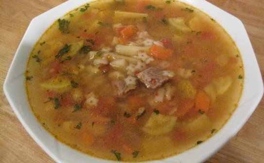 Se adaugă paste şi se mai lasă încă 15 minute la fiert, după care se ia de pe foc, se asezonează cu sare, piper şi doi căţei de usturoi zdrobiţi. La sfârşit se presară frunze de ţelină şi pătrunjel tăiate mărunt. Supa e acum gata pentru a fi degustată.
