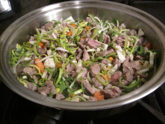 Carnea de vită se taie cubuleţe mici sau fâşii înguste, apoi se adaugă în oală. Se amestecă bine, până când carnea îşi schimbă culoarea, apoi se adaugă morcovii, ţelina, pătrunjelul şi păstârnacul. Se călesc timp de 2-3 minute, amestecând din când în când.