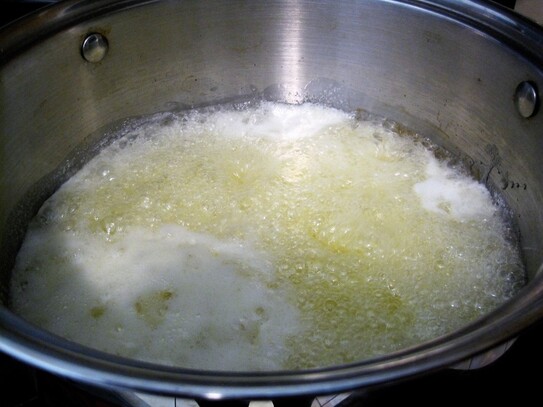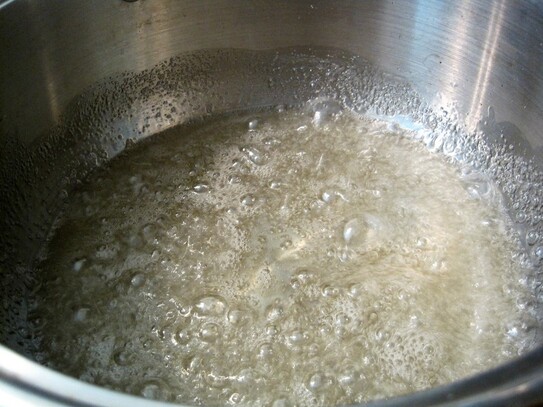 Vasul se pune la fiert la foc mediu până ce dă în clocot. Se continuă fierberea la foc mic, până ce spuma de deasupra dispare şi siropul este suficient de legat.