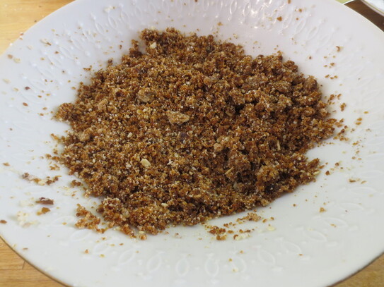 Mai întâi, curmalele, nuca de cocos şi fulgii de migdale se dau prin blender cam un minut, până când se sfărâmâ în bucăţele fine.