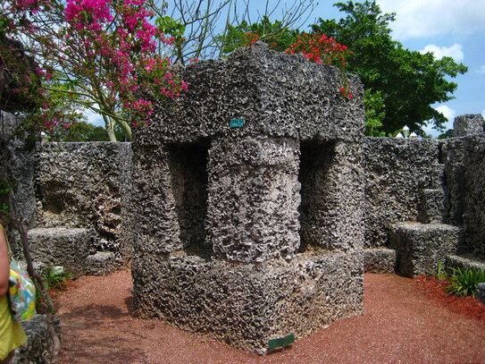 Această extraordinară operă de inginerie a fost proiectată şi construită de un singur om, Edward Leedskalnin, un sculptor amator leton care a imigrat în America. Întreaga structură este construită din blocuri mari de piatră unite fără utilizarea mortarului. Piatra folosită se numeşte calcar oolitic, numit şi piatra coral (de unde şi numele Castelul de Coral).