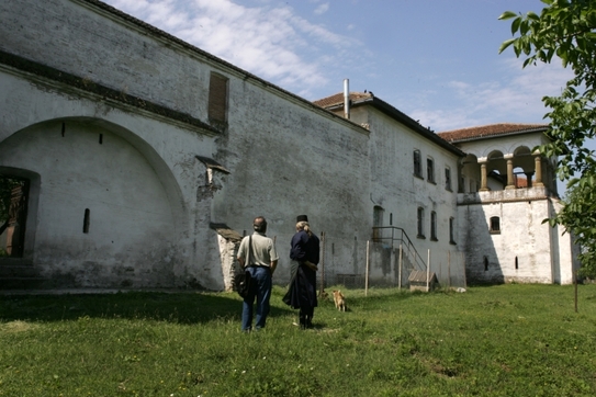 Râul Câlniştea, care curge în partea de Răsărit a satului Comana, întâlneşte în cale balta omonimă, pe care o străbate şi din care se desprinde în faţa mânăstirii. Pe la anul 1588, mânăstirea a fost reclădită de marele boier Radu Şerban, întrebuinţând ruinele rămase de la vechiul ansamblu monahal, în special zidul de incintă. În biserica al cărei hram e ”Sfântul Nicolae”, boierul s-a dorit zugrăvit pe zidul de la intrarea în pronaos, împreună cu soţia sa, Elina.