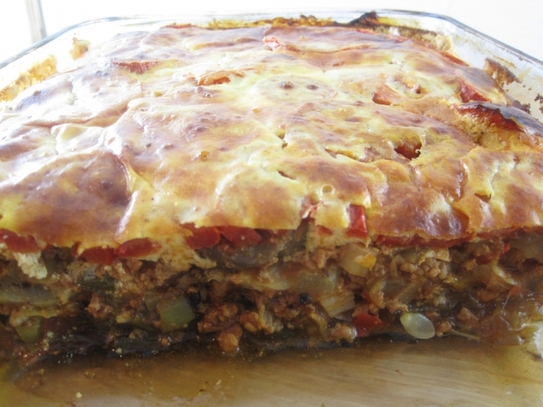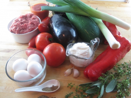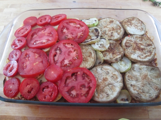 Într-un vas termorezistent, se aşează primul strat de vinete, apoi jumătate din compoziţia cu carne. Se continuă cu un strat de dovlecei, se adaugă următorul strat din sosul de carne rămas, după care se aşează, cel de-al doilea strat de vinete. Peste vinete, se aşează rondelele de roşii, şi se presară parmezanul ras. Cele 3 ouă rămase se bat bine, apoi se amestecă cu smântână. Se adaugă puţină sare, după care se toarnă deasupra peste roşii şi parmezan.
