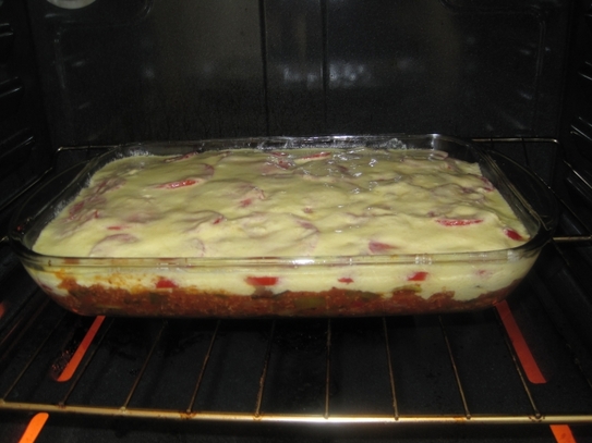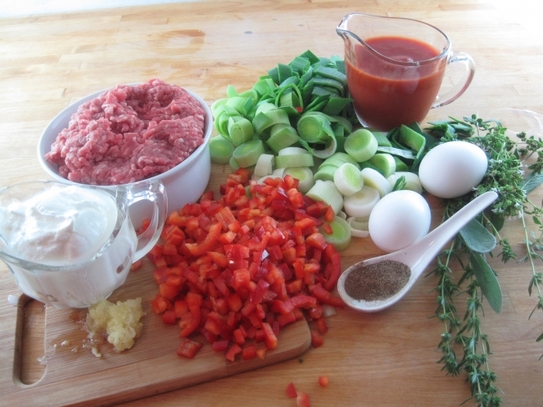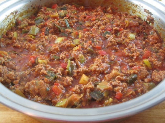 Într-o tigaie, se căleşte prazul tăiat rondele în ulei, până când devine uşor translucid, apoi se adaugă ardeiul mărunţit. Cam după un minut se adaugă usturoiul, şi imediat după usturoi se adaugă carnea măcinată (merge bine carnea de vită, viţel sau miel). Se condimentează cu sare şi piper, apoi se presară cimbru, oregano şi salvia mărunţite bine. Se lasă în continuare la foc mic cam 10 minute, până când carnea îşi schimbă culoarea, apoi se adaugă sucul de roşii. Se mai lasă să fiarbă totul împreună cam un sfert de oră, apoi se ia sosul de pe foc. După ce s-a răcit, se adaugă un ou bătut şi se amestecă bine.