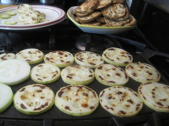 Vinetele şi dovleceii se curăţă de coajă, apoi se taie pe lăţime în rondele de 5 mm grosime. Rondele se rumenesc pe o plită încinsă sau pe grătar, se presară cu puţină sare după care se pun deoparte.