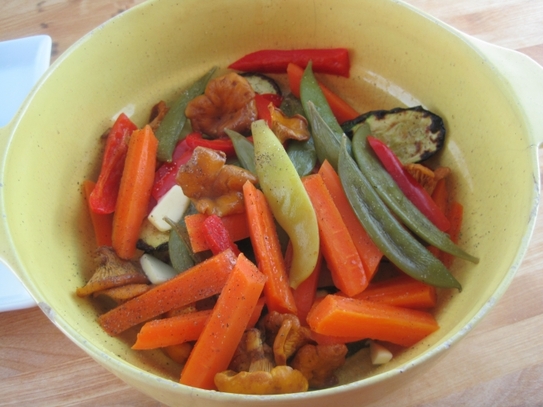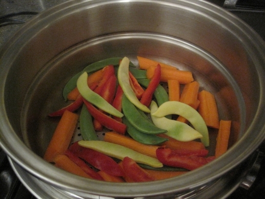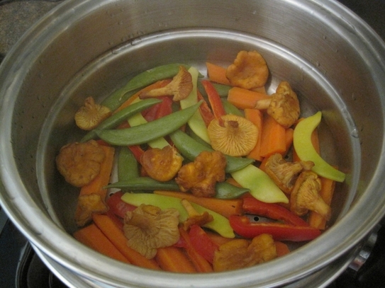 Morcovul şi ardeiul roşu tăiati în felii, mazărea şi fasolea verde, se pun într-o oală pe aburi, se acoperă şi se lasă la fiert cam 10 minute. Se adaugă apoi gălbiorii şi se mai lasă 5 minute, ceea ce e suficient ca să se pătrundă şi să-şi menţină culoarea şi aroma nealterate.