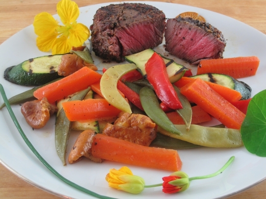 Muşchiuleţ de vită la grătar servit cu gălbioare şi legume înăbuşite în unt