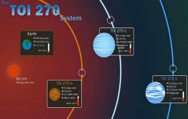 Dintre cele trei noi exoplanete descoperite acum - numite TOI-270 - una este stâncoasă şi puţin mai mare decât Pământul, iar celelalte două sunt gazoase şi sunt aproximativ de două ori mai mari decât planeta noastră, potrivit Universităţii din California, care a condus această cercetare. Noul „sistem” - trei planete şi steaua lor gazdă - a primit acest nume, fiind „obiectul de interes” numărul 270 descoperit de satelitul de la NASA (Tess Object of Interest).