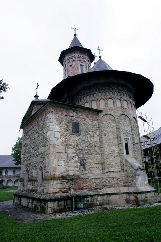 Turla se înalţă la mijloc, iar nouă contraforturi masive susţin zidurile până la nivelul bolţilor. Biserica este ornată pe din afară cu şiruri de cărămidă smălţuită, aplicate pe faţade. În partea de sus a zidului se află două rânduri de ocniţe, 11 mari şi 17 mici, unele dintre ele având încă urme de pictură. Decoraţia exterioară a bisericii consacră stilul moldovenesc, rezultat din îmbinarea elementelor bizantine şi gotice, adaptate stilului autohton.