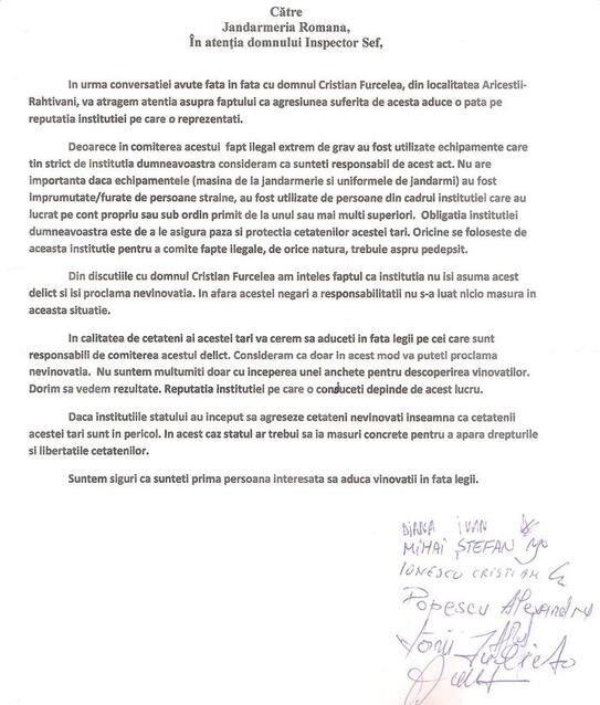 În data de 24. 03. 2014, cât Cristian Furcelea era în spital, câţiva activişti de mediu şi/sau oameni pur si simplu impresionaţi de povestea lui, printre care Sandu Popescu, cel care a făcut greva foamei în Piaţa Universităţii pentru drepturile sătenilor din Pungeşti, au trimis o sesizare Inspectoratului de Judeţean de Jandarmi Prahova (IJJP), cerând ca cei vinovaţi de agresiunea împotriva dlui Furcelea, fie ei jandarmi sau persoane care ar fi furat duba instituţiei, uniforme de jandarmi etc. să fie aduşi în faţa instanţei. "Reputaţia instituţiei pe care o conduceţi depinde de acest lucru. (...) Suntem siguri că sunteţi prima instituţie interesată să aducă vinovaţii în faţa legii", arătau semnatarii scrisorii.