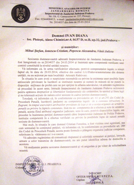 O zi mai târziu, jandarmeria a trimis un răspuns politicos, în care se afirma că nicio maşină a IJJP nu a acţionat pe teritoriul localităţii Ariceştii Rahtivani în ziua comiterii agresiunii şi le cere semnatarilor scrisorii ca, dacă există "o suspiciune rezonabilă cu privire la existenţa unor posibile fapte antisociale ale instituţiei" şi sunt "în măsură să pună la dispoziţie mijloacele de probă", care-i pot sprijini pe jandarmi în aflarea adevărului, să procedeze în acest sens, căci IJJP acţionează "pentru apărarea drepturilor şi libertăţilor cetăţeneşti."