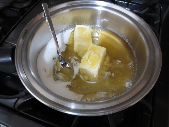 Untul, mierea şi zahărul se pun într-o cratiţă mai mică şi se topesc la bain marie câteva minute, până când untul se topeşte complet. Siropul obţinut se lasă deoparte să se răcească.